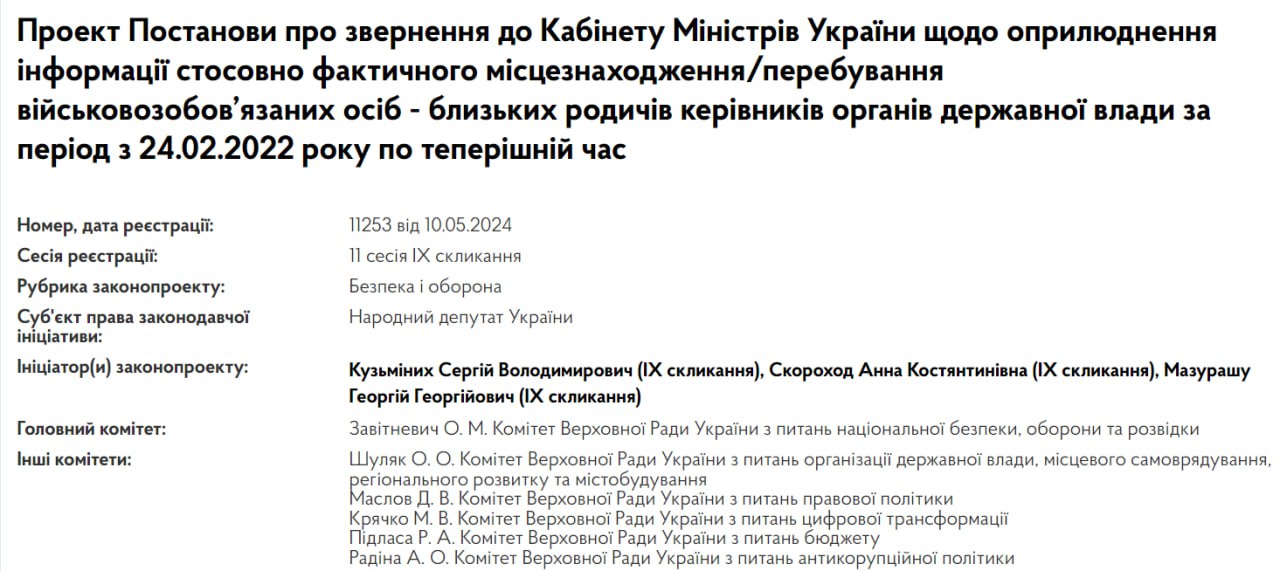 В Верховной Раде предлагают обнародовать места нахождения военнообязанных родственников руководителей органов государственной власти для их мобилизации.