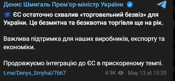 "ЕС окончательно одобрил "торговый безвиз" для Украины. Это беспошлинная и бесквотная торговля еще на год", - написал он.