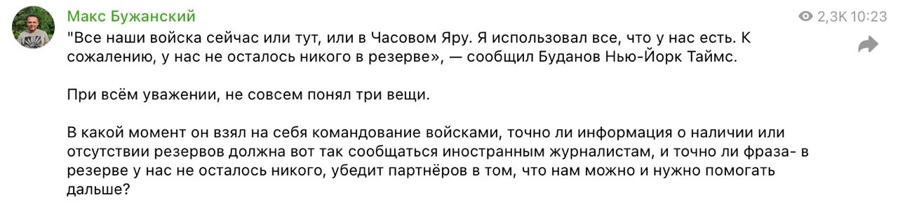 "При всём уважении, не совсем понял три вещи. В какой момент он взял на себя командование войсками, точно ли информация о наличии или отсутствии резервов должна вот так сообщаться иностранным журналистам, и точно ли фраза - в резерве у нас не осталось никого, убедит партнёров в том, что нам можно и нужно помогать дальше?" - пишет Бужанский.