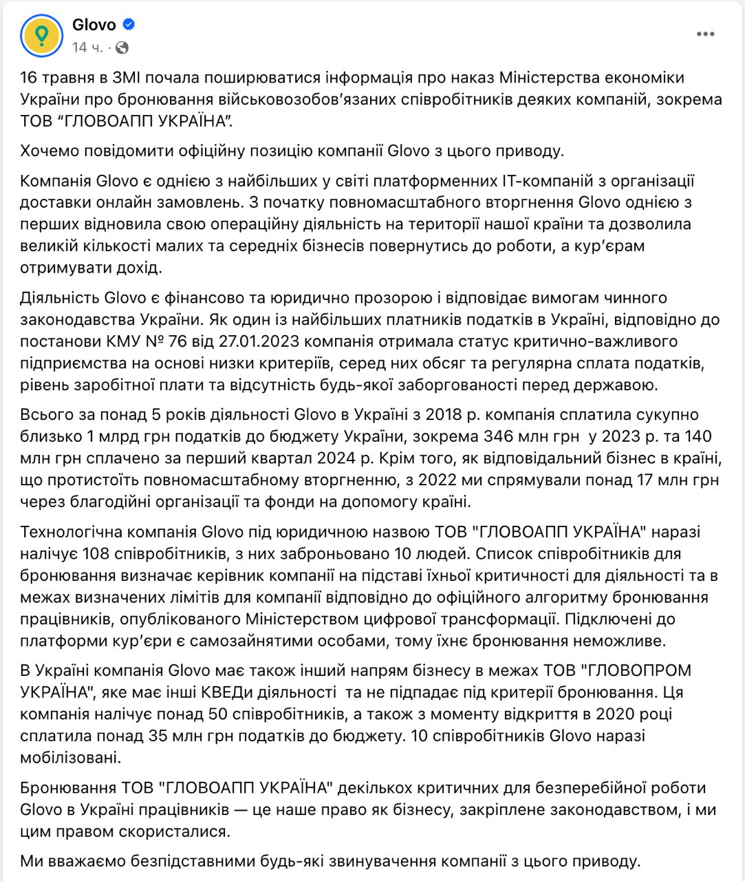 В Glovo заявили, что законно получили статус критически важного предприятия на основе ряда критериев, среди которых объем уплаченных налогов, и хотели забронировать 10 сотрудников из 108. Это не курьеры - они самозанятые.