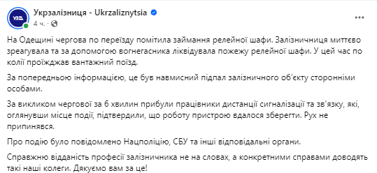 А недавно подобный поджог произошел в Одессе. Неизвестные подожгли резервные аккумуляторы для резервного питания железнодорожных светофоров.