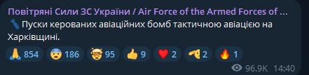 Воздушные силы ВСУ перед взрывами сообщали о пусках управляемых авиационных бомб тактической авиацией.