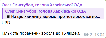 Напомним, вчера днем российские войска нанесли удар по Харькову. В результате повреждены 23 частных дома, 3 автомобиля, 3 гаража и линия электросетей. Пострадали 6 человек, в том числе 2 ребенка 13 и 16 лет.