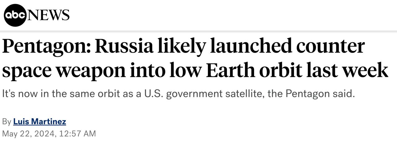 "16 мая Россия запустила на низкую околоземную орбиту спутник, который, по нашим оценкам, скорее всего, является противокосмическим оружием, предположительно способным атаковать другие спутники на низкой околоземной орбите", - сказал Райдер.