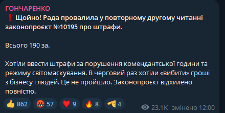 "Хотели ввести штрафы за нарушение комендантского часа и режима светомаскировки. В очередной раз хотели "выбить" деньги из бизнеса и людей. Это не прошло. Законопроект отклонен полностью", - комментирует Гончаренко.