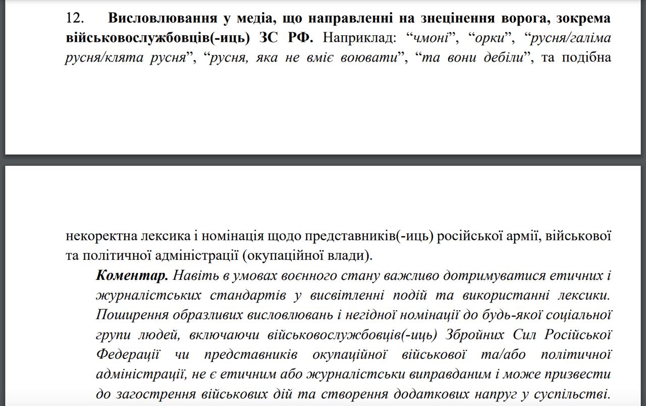 "Некорректная лексика по отношению к представителям оккупационной российской армии, военной и политической администрации (оккупационной власти) не способствуют объективному и открытому информированию общественности и могут ухудшить восприятие медиа как надежного источника информации", - говорится в тексте документа.