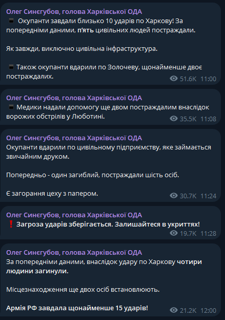 Об этом сообщают в своих телеграм-каналах глава Харьковской ОВА Олег Синегубов и мэр Харькова Игорь Терехов.