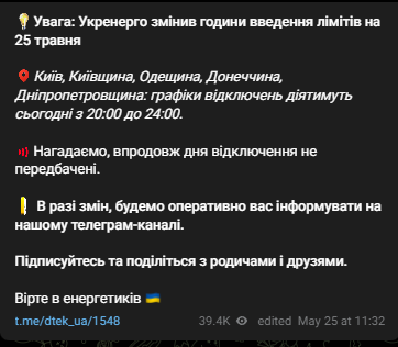 По словам гендиректора Yasno, отключение света в Киеве сегодня, 25 мая, продлится в период с 20:00 до 24:00, что на два часа дольше, чем планировалось.