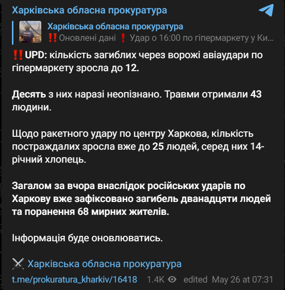 08:30 Количество погибших в результате вчерашней атаки РФ на "Эпицентр" в Харькове увеличилось до 12 человек. Ранены 43 человека.