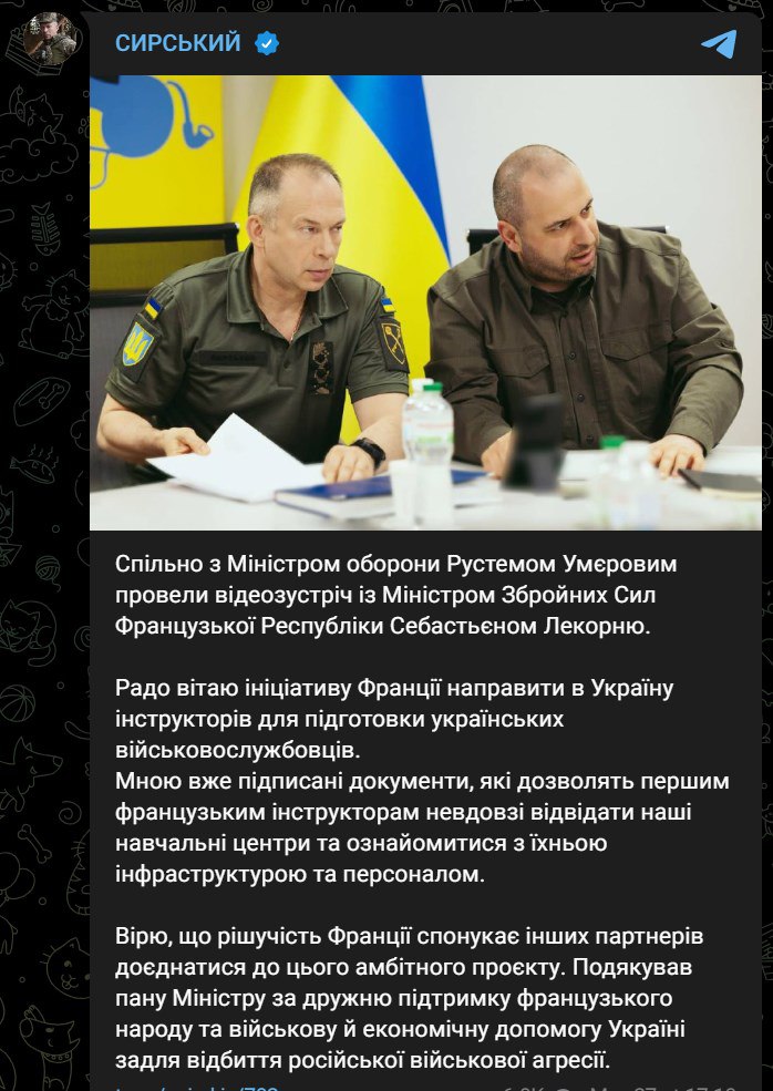 "Приветствую инициативу Франции направить в Украину инструкторов для подготовки украинских военнослужащих. Мною уже подписаны документы, которые позволят первым французским инструкторам посетить наши учебные центры и ознакомиться с их инфраструктурой и персоналом", - сообщил главком по итогам видеовстречи с министром обороны Франции Лекорню.