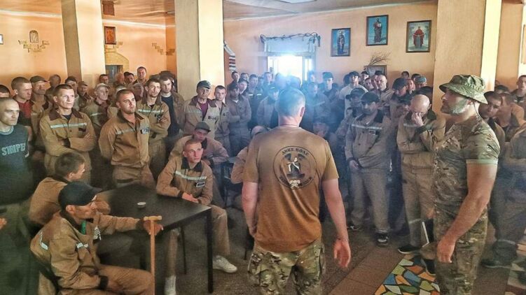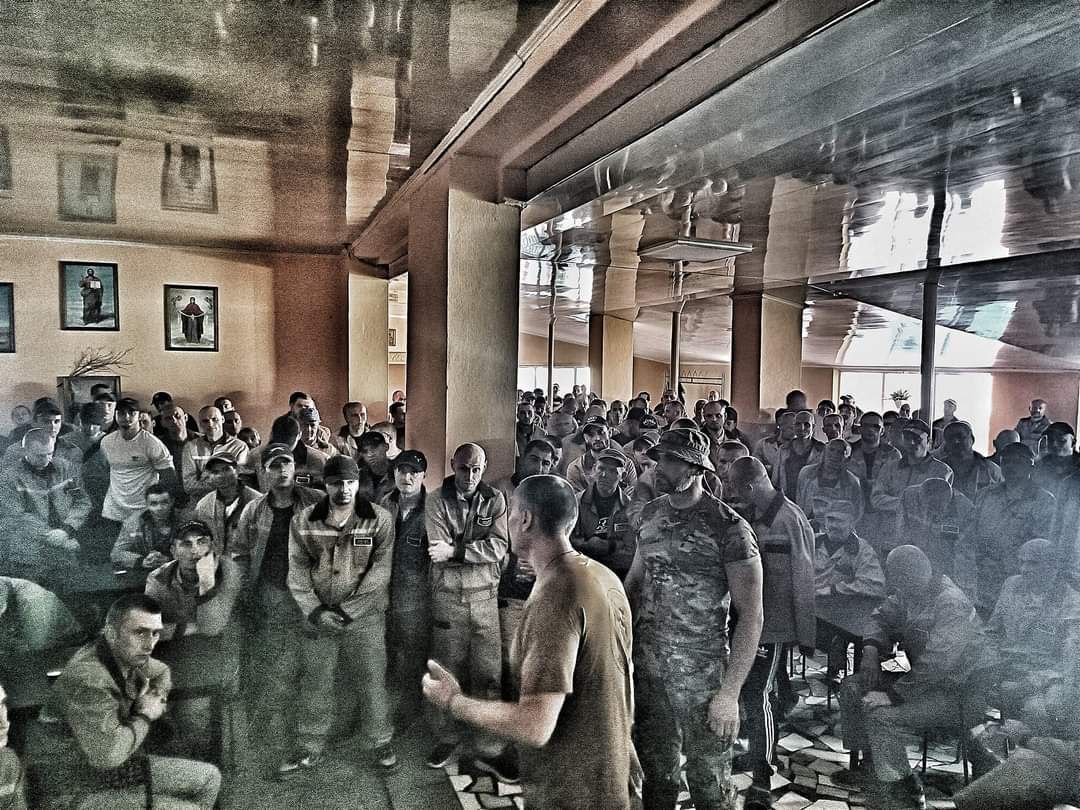 Фото общения с группой заключённых опубликовал в Фейсбуке представитель отдельного штурмового батальона "Да Винчи" Дмитрий Савченко.