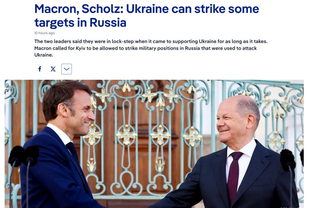 Напомним, что вчера на встрече с Шольцем за разрешение Украине применять западные вооружения по территории РФ высказался президент Франции Макрон. При этом он не уточнил, давал ли Париж Киеву свое официальное разрешение.