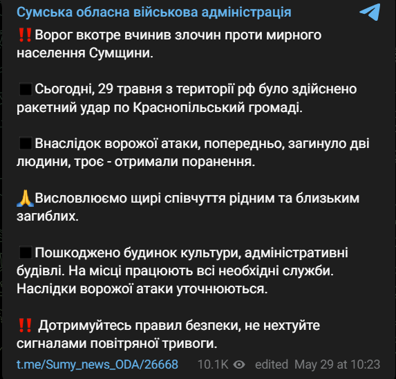 Сегодня днем российские войска нанесли ракетный удар по Краснопольской громаде Сумской области. В результате вражеской атаки два человека погибли и трое ранены.