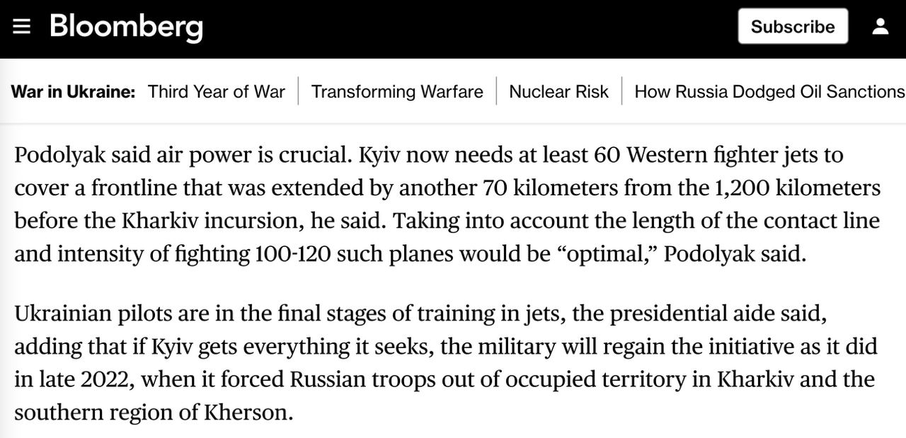 "Киеву сейчас нужно по меньшей мере 60 истребителей для контроля линии фронта, оптимальным было бы получить 100-120 самолетов", - сообщил он.