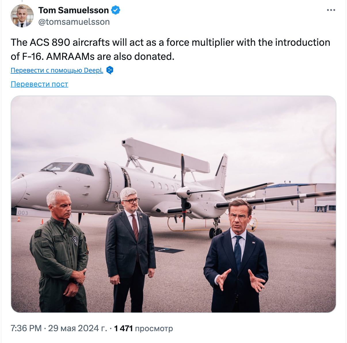 "В пакет входят два самолета воздушного наблюдения и управления (ACS890), которые помогут Украине идентифицировать цели на большом расстоянии", - написал в соцсети Х представитель шведского премьер-министра Том Самуэльссон.
