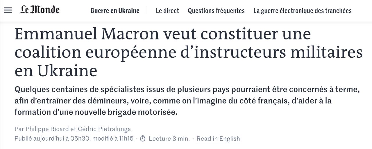 13.30 Макрон хочет сформировать европейскую коалицию военных инструкторов, работающих непосредственно в Украине, пишет Le Monde со ссылкой на источники.