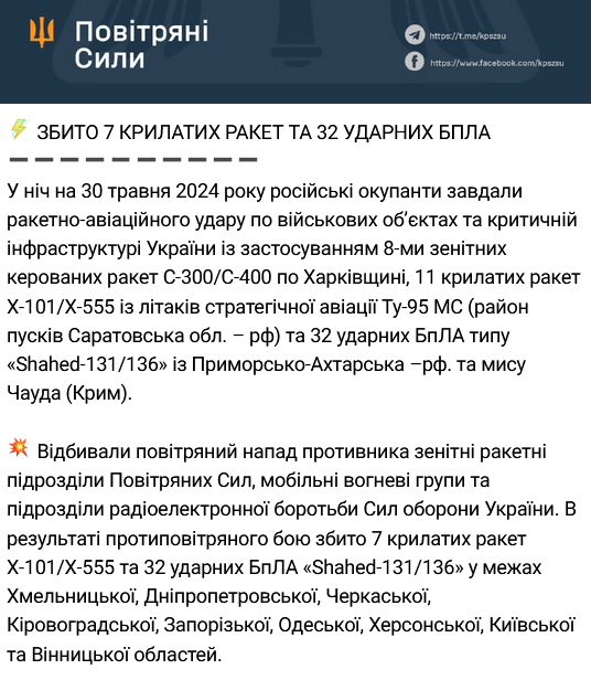 Ночью 30 мая по Украине была ракетная атака, комбинированная с ударными беспилотниками.