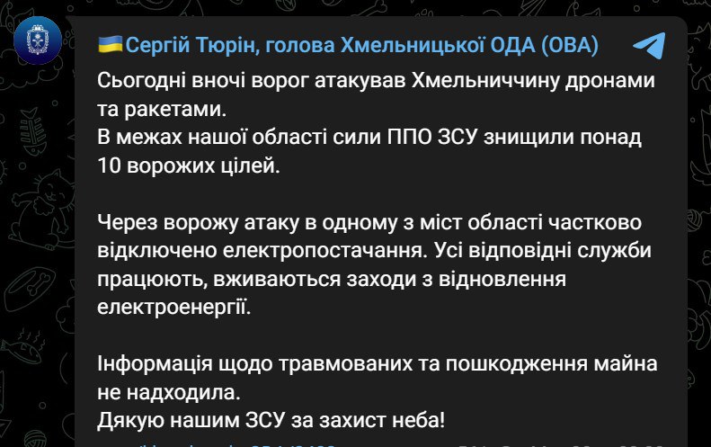 Между тем власти Хмельницкой области подтвердили ночной удар по региону.