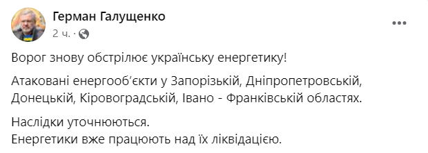 Министр энергетики Герман Галущенко сообщил, что россияне обстреляли украинскую энергетику. Атакованы энергообъекты в Запорожской, Днепропетровской, Донецкой, Кировоградской, Ивано-Франковской областях.