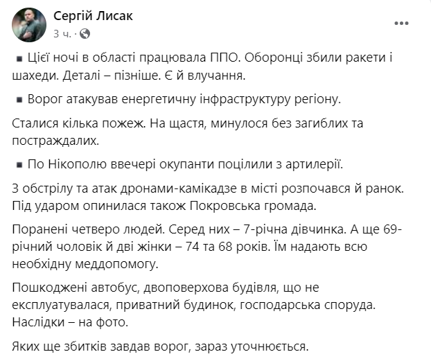 "Ранены четыре человека. Среди них – 7-летняя девочка. А еще 69-летний мужчина и две женщины – 74 и 68 лет. Им оказывают всю необходимую медпомощь", - написал Лысак.