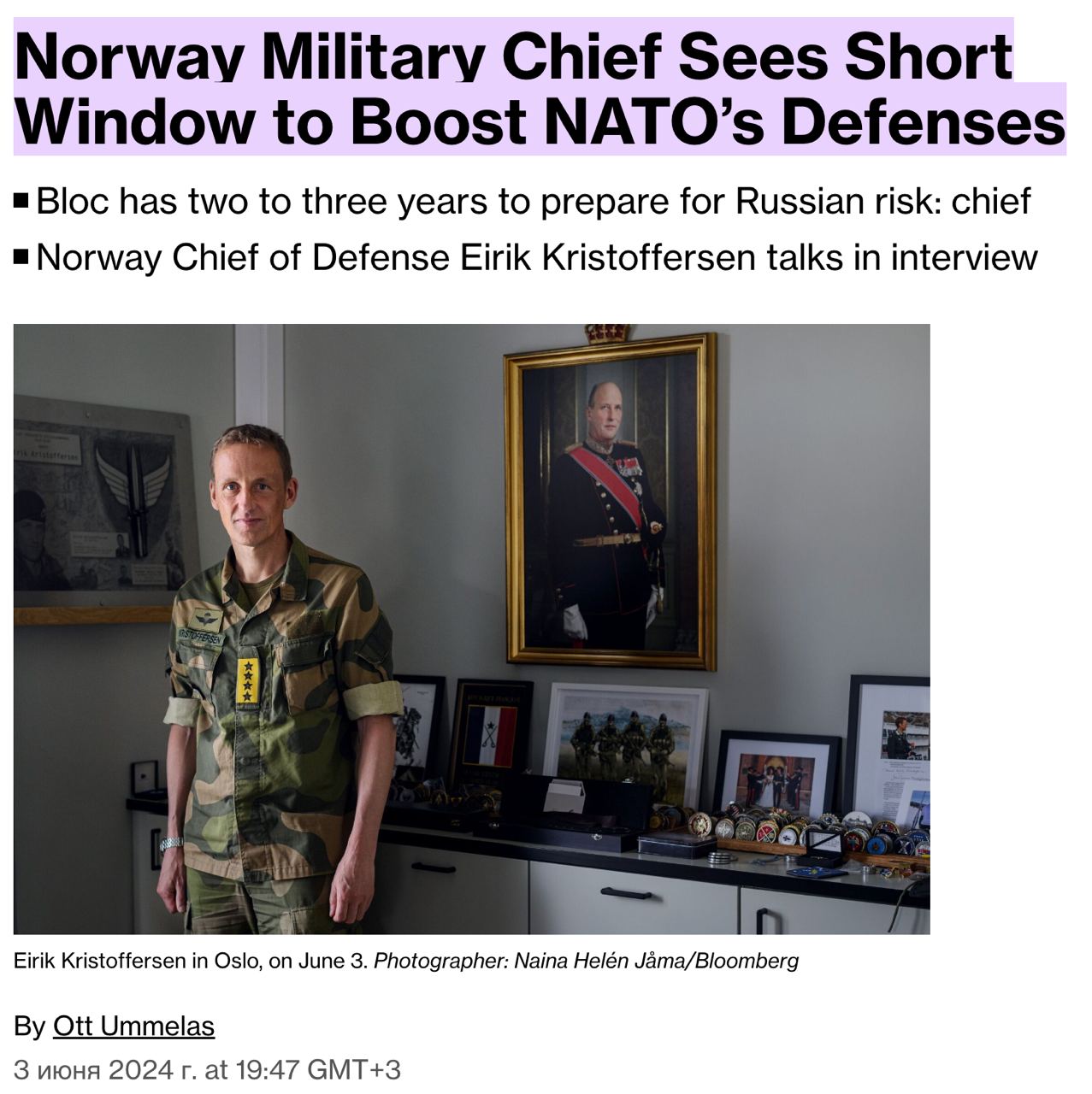 09:25 У НАТО есть два-три года, чтобы подготовиться к возможному российскому нападению, заявил Bloomberg глава Вооруженных сил Норвегии генерал Эйрик Кристофферсен.