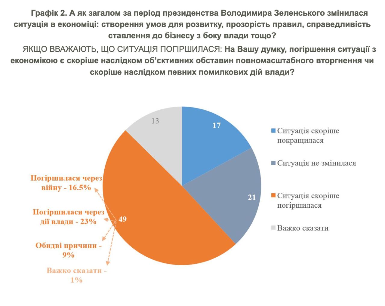 Аналогичная оценка и ситуации с экономикой. 49% сказали, что она ухудшилась (23% связали это с действиями власти, 16,5% - с войной). 21% изменений не увидели, 17% - увидели.