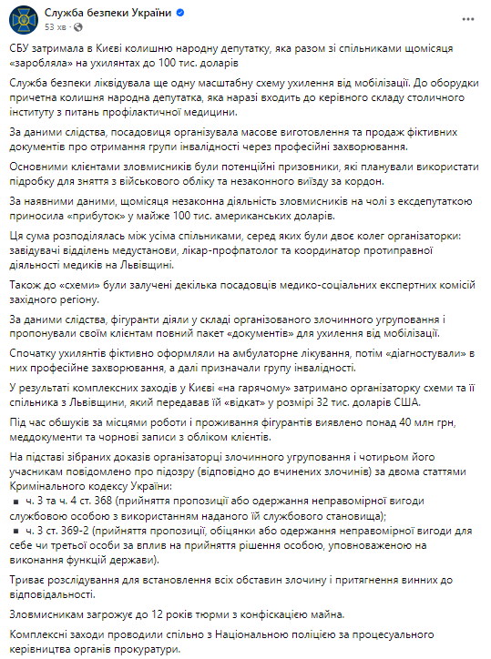 "Служба безопасности ликвидировала еще одну масштабную схему уклонения от мобилизации. К сделке причастна бывшая народная депутат, которая сейчас входит в руководящий состав столичного института по вопросам профилактической медицины", - говорится в сообщении.