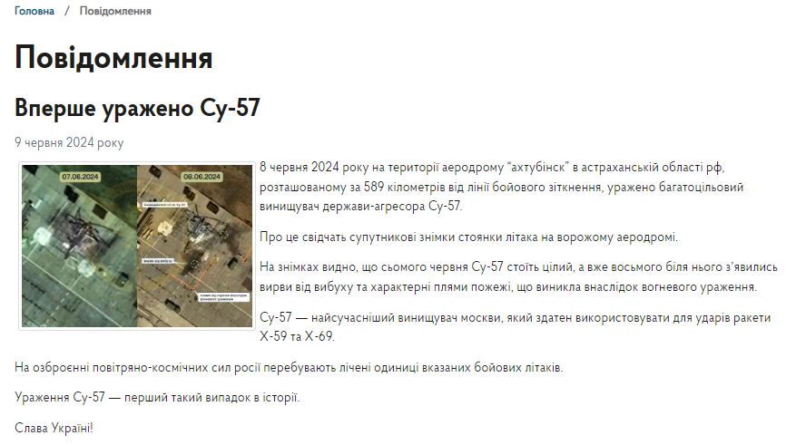 В субботу, 8 июня, на территории аэродрома "Ахтубинск" в Астраханской области РФ, расположенном в 589 километрах от линии боевого столкновения, поражен многоцелевой истребитель Су-57.
