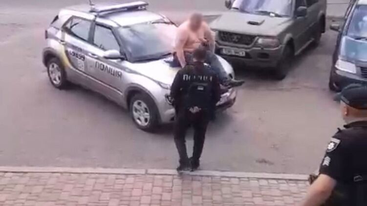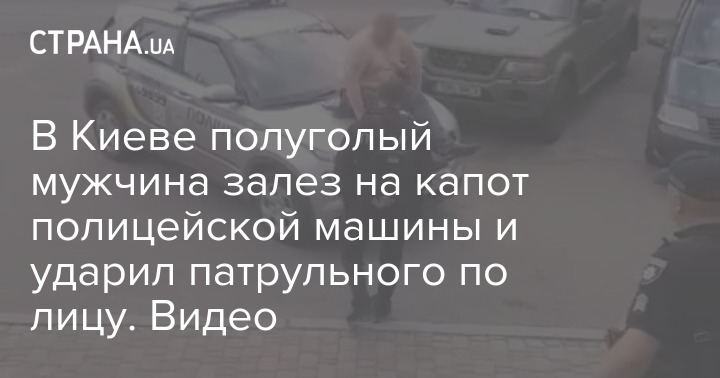 В Киеве мужчина с голым торсом уселся на капот полицейской машины, а после ударил по лицу правоохранителя.