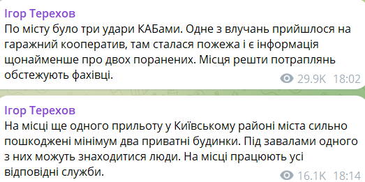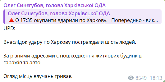 В свою очередь глава Харьковской ОВА Олег Синегубов сообщил, что в результате удара по Харькову пострадали шесть человек, повреждены жилые дома, гаражи и авто.