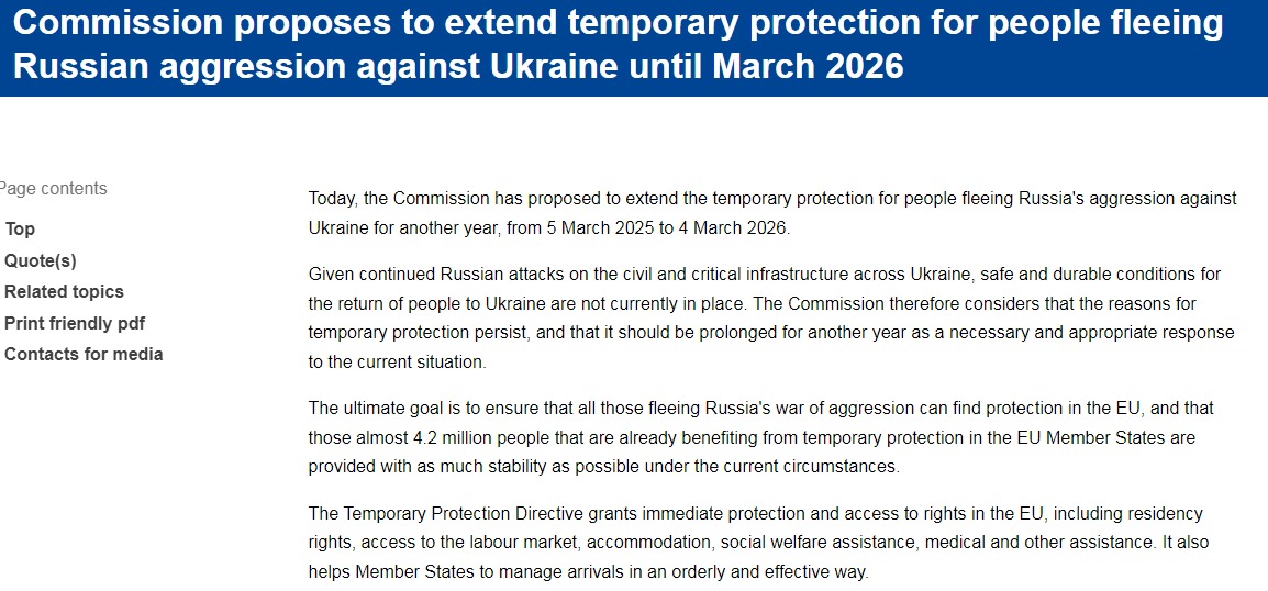 Европейская комиссия предложила продлить временную защиту для украинских беженцев на один год: с 5 марта 2025 года по 4 марта 2026 года.