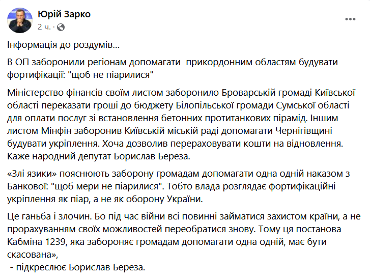 По его словам, Министерство финансов не согласовало передачу денег из бюджета Броварской общины в бюджет Белополья, чтобы оплатить услуги по установке бетонных противотанковых пирамид.