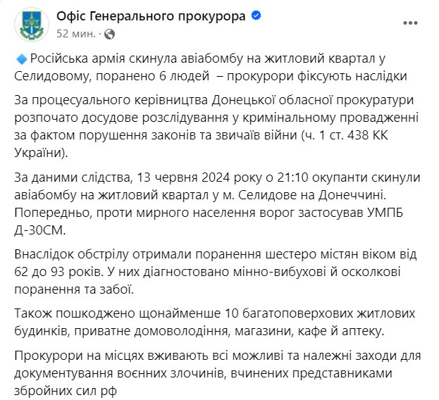 По данным следствия, 13 июня 2024 года в 21:10 оккупанты сбросили авиабомбу на жилой квартал в Селидово. Предварительно армия РФ применила УМПБ Д-30СМ.