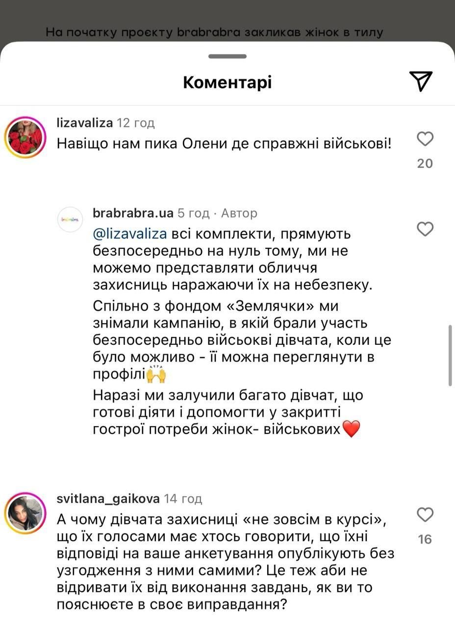 Инициатива "Одна за одну", в рамках которой была запущена реклама, призвана обеспечить "качественными комплектами защитниц и актуализировать важность темы комфортного белья для женщин на передовой". Однако пользователи социальных сетей начали обвинять бренд brabrabra и Кравец в неадекватном креативе и пиаре на теме военных.