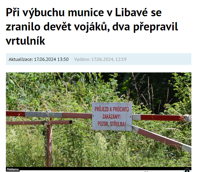 В понедельник, 17 июня, на военном полигоне Либава под городом Оломуц в Чехии взорвался неизвестный боеприпас. Раньше на этом полигоне проходили тренировки украинские военные.