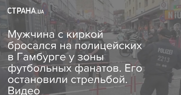 Мужчина с киркой бросался на полицейских в Гамбурге у зоны футбольных фанатов. Его остановили стрельбой. Видео