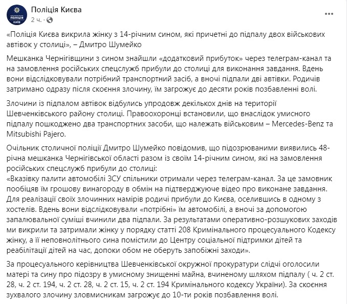 А в Киеве к поджогу двух военных автомобилей оказались причастны  48-летняя жительница Черниговской области вместе со своим 14-летним сыном.