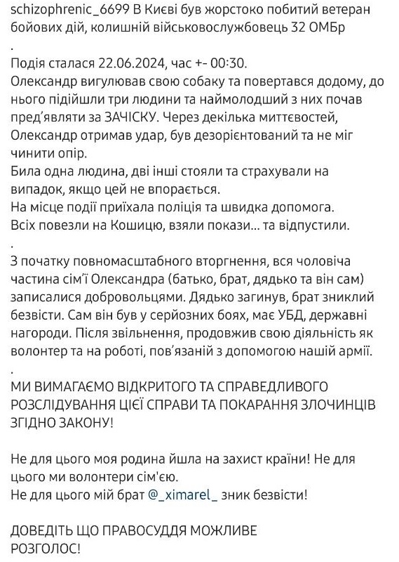 В Киеве вчера вечером избили ветерана боевых действий, бывшего военнослужащего 32 ОМБр Александра. Об этом сообщила его сестра на своей странице в Instagram.