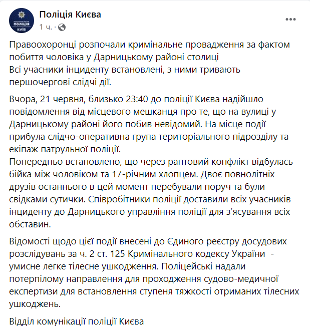 В полиции сообщили, что возбуждено уголовное производство по факту избиения мужчины в Дарницком районе столицы. Все участники инцидента установлены, с ними продолжаются первоочередные следственные действия.