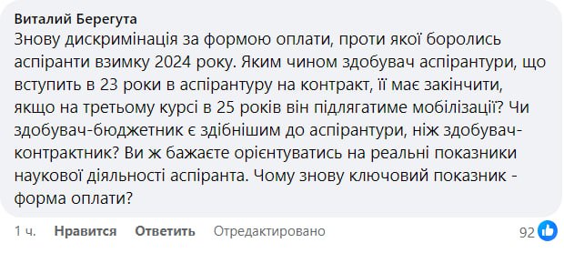 Виталий Берегута: "Снова дискриминация по форме оплаты, против которой боролись аспиранты зимой 2024 года. Каким образом соискатель аспирантуры, который вступит в 23 года в аспирантуру по контракту, ее должен закончить, если на третьем курсе в 25 лет он будет подлежать мобилизации? Действительно ли соискатель-бюджетник способнее к аспирантуре, чем соискатель-контрактник? Вы же хотите ориентироваться на реальные показатели научной деятельности аспиранта. Почему снова ключевой показатель – форма оплаты?"