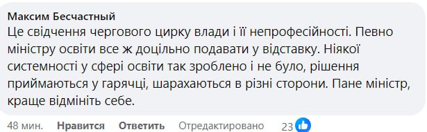 Максим Бесчастный: "Это свидетельство очередного цирка власти и ее непрофессионализма. Наверное, министру образования все же целесообразно подавать в отставку. Никакой системности в сфере образования так сделано и не было, решения принимаются в горячке, шарахаются в разные стороны. Министр, лучше отмените себя".