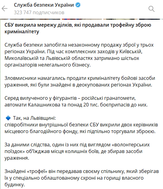 Спецслужба заявляет, что шестерых организаторов нелегального бизнеса задержали в Киевской, Николаевской и Львовской областях. Среди изъятого у фигурантов – российские гранатометы, автоматы Калашникова и более 20 тысяч боеприпасов к ним.
