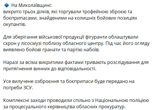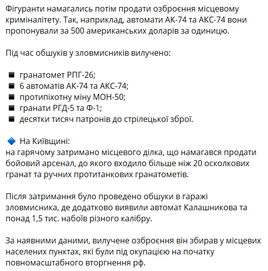 Ранее мы писали, что в Донецкой области были задержаны двое дельцов, которые хотели продать криминалитету трофейное российское оружие, которое добыли украинские защитники в жестоких боях под Бахмутом. Среди изъятого у злоумышленников оказалось более 60 автоматов и пулемётов, а также противотанковые гранатомёты российского производства".
