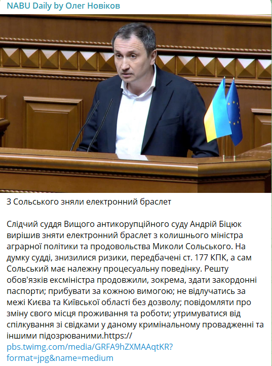С бывшего министра аграрной политики и продовольствия Николая Сольского сняли электронный браслет. Об этом сообщает журналист Олег Новиков.