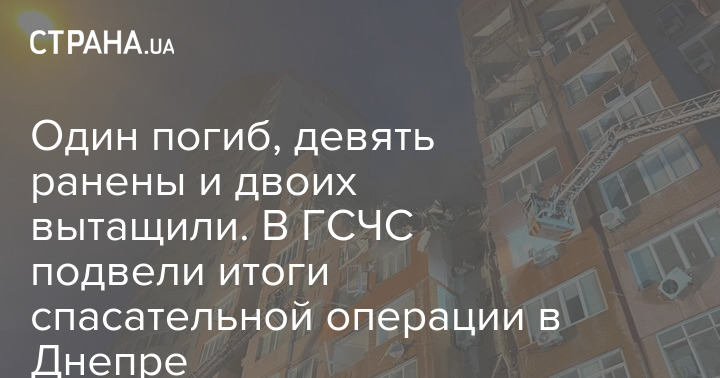 По состоянию на 22:30 в пострадавшем от прилета десятиэтажном доме в Днепре погиб один человек, травмированы девять, спасены из-под завалов два. Шестеро пострадавших находятся в больнице, среди них беременная женщина.