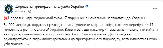 "В 200 метрах от границы пограничники остановили микроавтобус, в котором находились 17 мужчин из разных областей Украины. Оказалось, что пассажиры пытались незаконно уехать за границу, оплатив путешествие от 3 до 12 тысяч долларов. Для составления админпротоколов задержанных доставили в пограничное подразделение, устанавливается круг всех причастных" - говорится в сообщении.