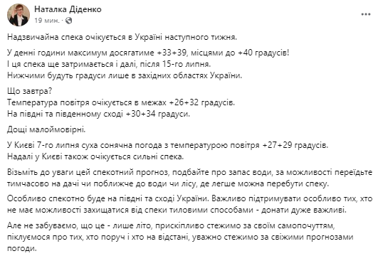 "В дневные часы максимум будет достигать +33+39, местами до +40 градусов", - пишет она.