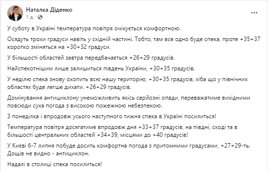 "Температура воздуха будет достигать в течение дня +33+37 градусов, на юге, востоке и большинстве центральных областей +34+39, местами до +40 градусов! В Киеве 6-7 июля будет достаточно комфортная погода с сознательными градусами, +27+29-ть. Дождей не видно – антициклон", - заявила она.