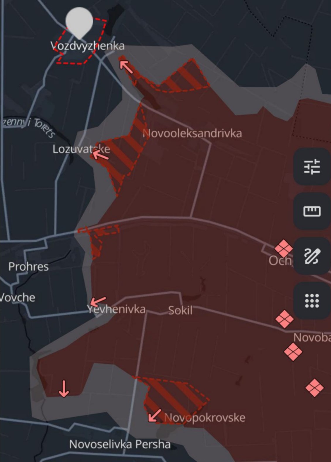 При этом Deep State указывает, что российские войска продвинулись в направлении трассы Покровск - Константиновка. А именно - к селу Воздвиженка, которое прикрывает трассу (оттуда до этой дороги около пяти километров).