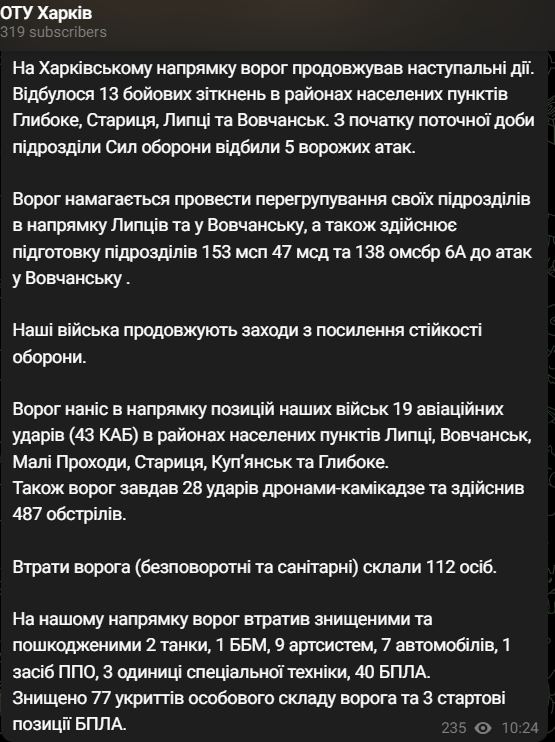 15:06 Российские военные осуществляют подготовку подразделений для атак в Волчанске, сообщает ОТГ "Харьков".